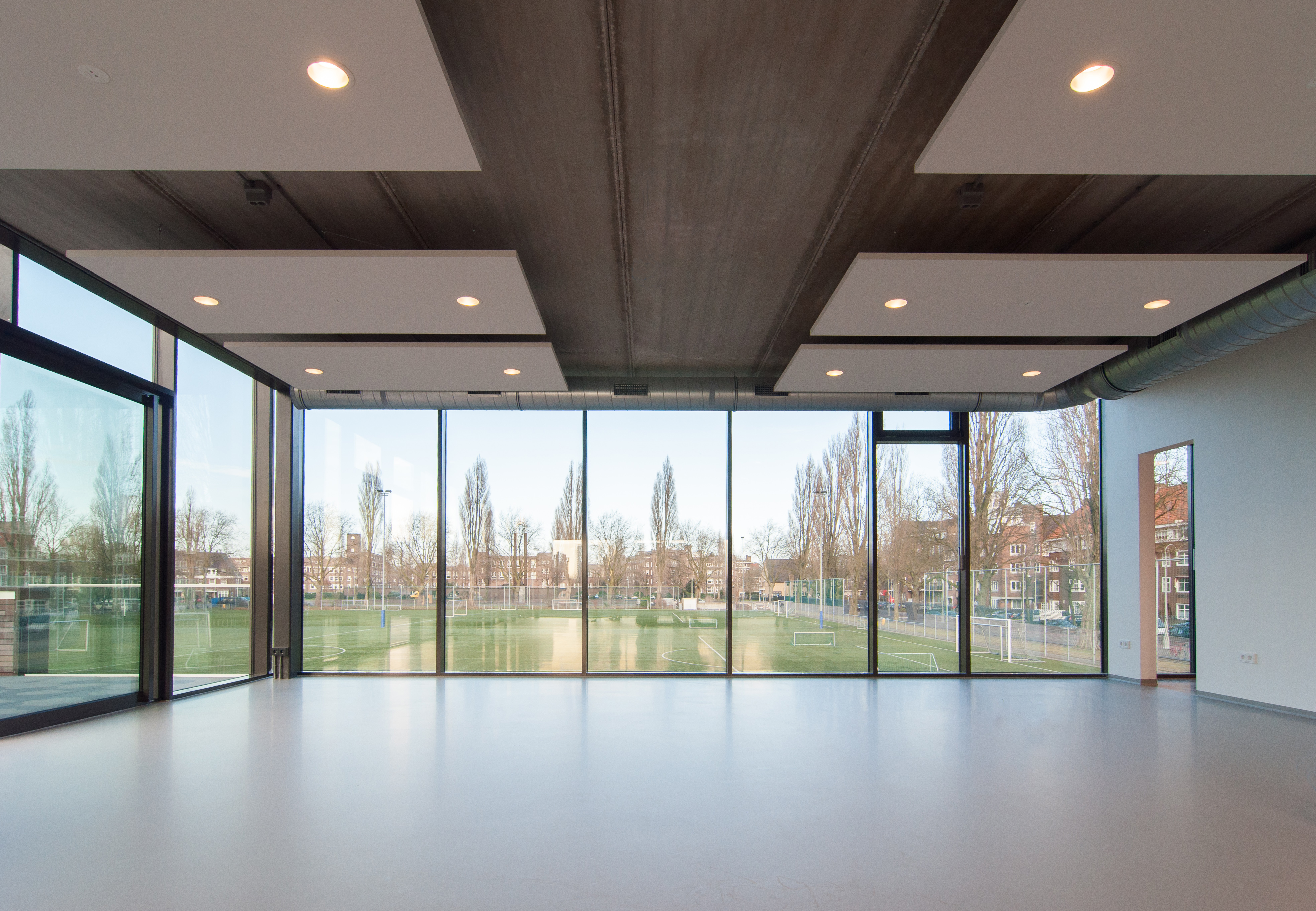Op het Olympiaplein in Amsterdam-Zuid wordt al sinds 1928 gesport. Bijna honderd jaar later staat centraal tussen de voetbalvelden het nieuwe clubhuis van voetbalclub Swift. XOOMlab-collega Dirk Jan van Wieringhen Borski (BNB) heeft een gebouw ontworpen dat recht doet aan de architectuur in het plan Zuid van Berlage. Bart van den Ende (XOOMlab/ AVBouwplannen) heeft de uitvoering tot op het laatste detail begeleidt. Het gebouw is opgetrokken uit een verlengde baksteen met een diepe voeg. Binnen zijn de kleuren van Swift, spierwit en diepblauw maximaal uitgebuit. De kantine en het grote terras kijken uit over de velden. Het gebouw is bijzonder duurzaam, met douche-circulatie, led-verlichting, bewegingssensoren en natuurlijk een groen dak.