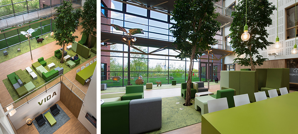 Dirk Jan en Ted hebben zich laten inspireren door de vide. Bij de entree is een deel van de vloer weggezaagd om direct contact te maken met het atrium. De vloer van het atrium loopt door in het dakterras dat op het noorden over de weiden van de Bretten uitkijkt. Het beschaduwde terras heeft een kunstgrasweide gekregen met een verzameling schapen. Het gras verbindt binnen met buiten. De entresol en de ruimtes aan de grote vide zijn een ontmoetingsplek voor de kleinere bedrijven. Het frisse groen met het schaap centraal is het nieuwe logo van vida.