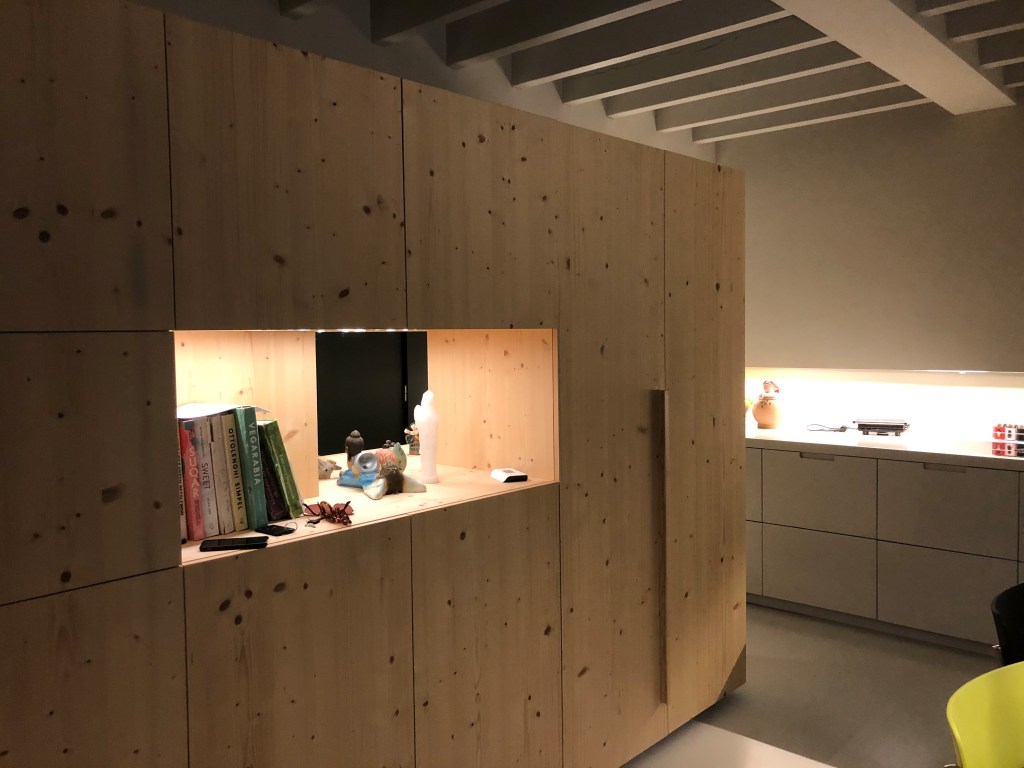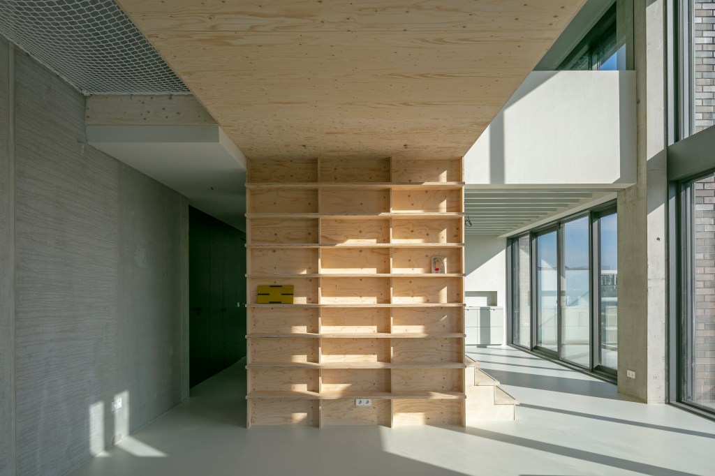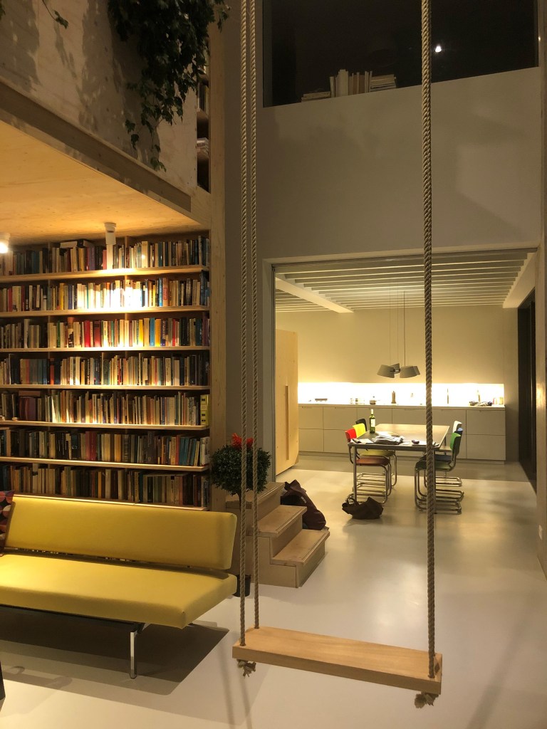 Het houten kastenblok verdeelt de ruimte in een entree, een keuken en een woonkamer. In de vide hangt een houten schommel om het hoog in de lucht gevoel compleet te maken.