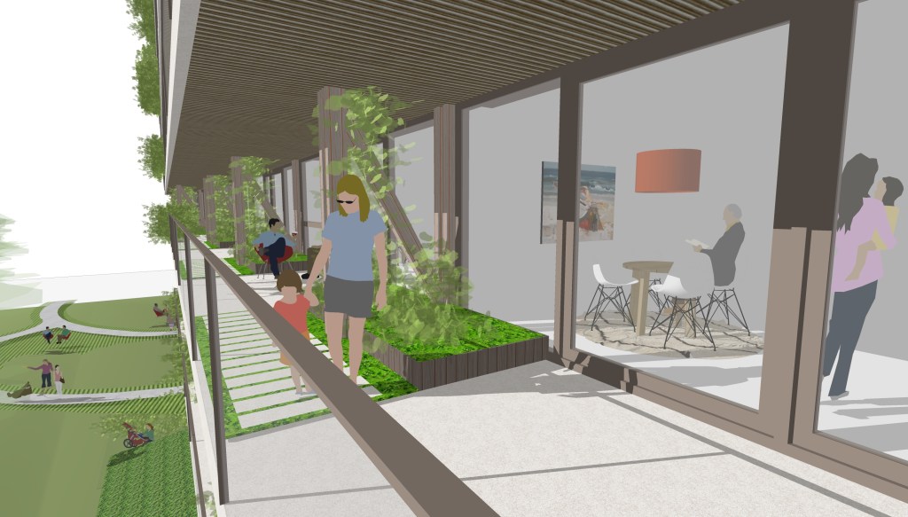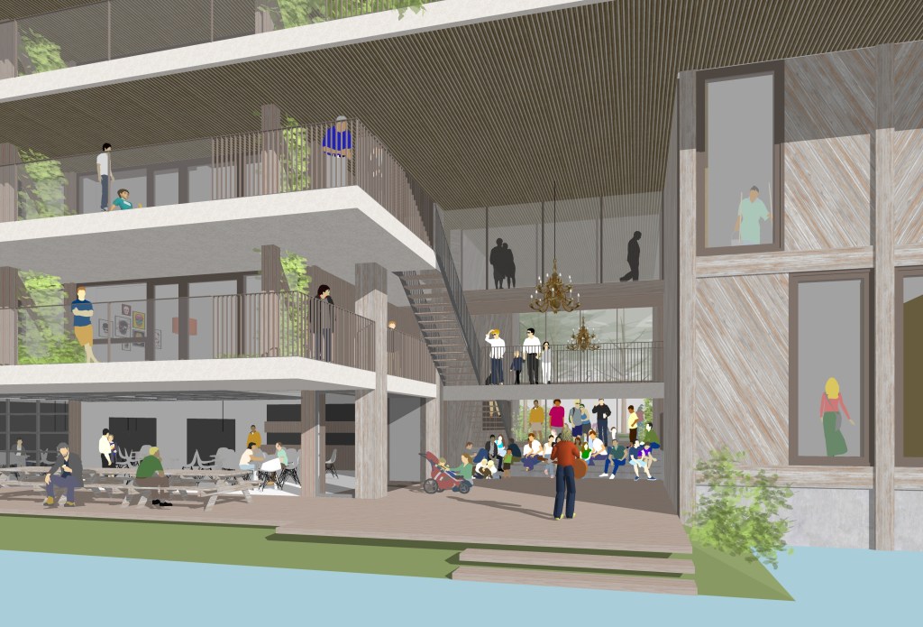 Aan het water is een steiger waaraan gemeenschappelijke ruimtes liggen. Een gemeenschappelijke keuken en afhankelijk van de keuzes van de coöperatie atelierruimtes, werkruimtes, wasmachineruimtes en bergruimte voor grote spullen.