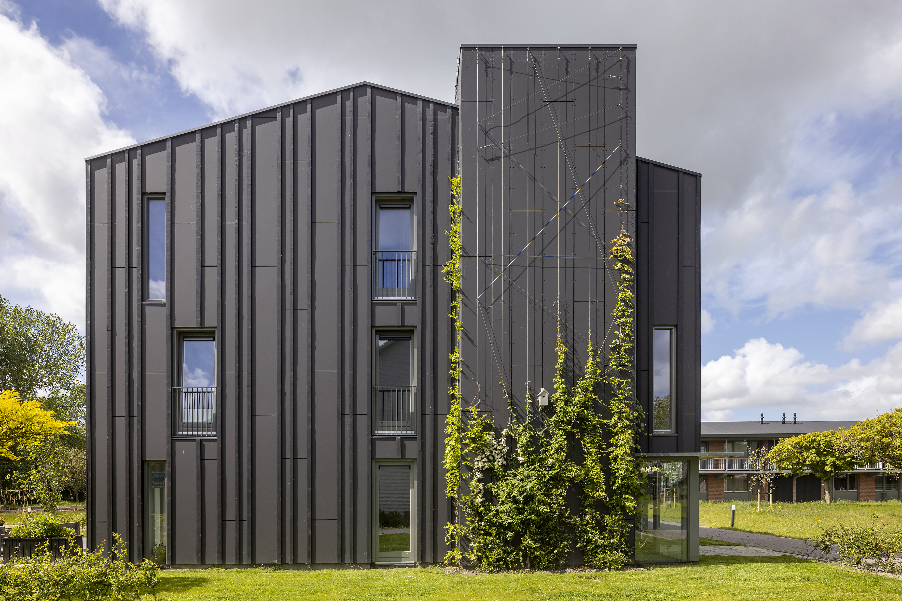 Het gebouw voor de Downdriehoek dat nu gebouwd wordt. Al twintig jaar ben ik samen met mijn collega Jeroen Snel bezig om het voormalige woonzorgcomplex in het Noordhollandse Winkel te tranfomeren tot woningen voor starters, voor ouderen en voor speciale doelgroepen. We doen dit voor corporatie de Wooncompagnie onder de bevlogen leiding van Jan Berghout. Het project voor jongeren met het syndroom van Down is de kroon op dit werk. Hun ouders zochten een plek waar deze groep begeleid kan wonen. Het is heel bijzonder dit voor ze te ontwerpen en te bouwen.